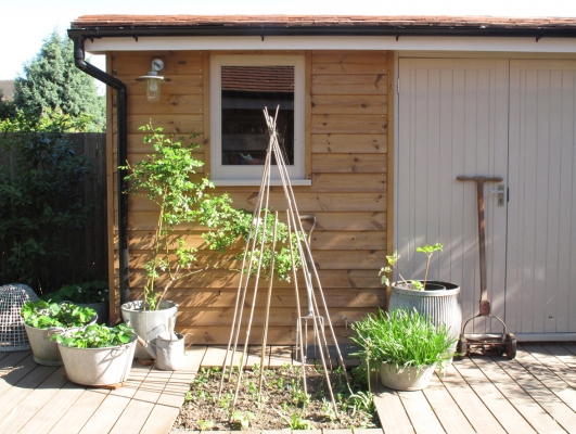 The garden shed opposite the summerhouse offers a further background to exterior shots.